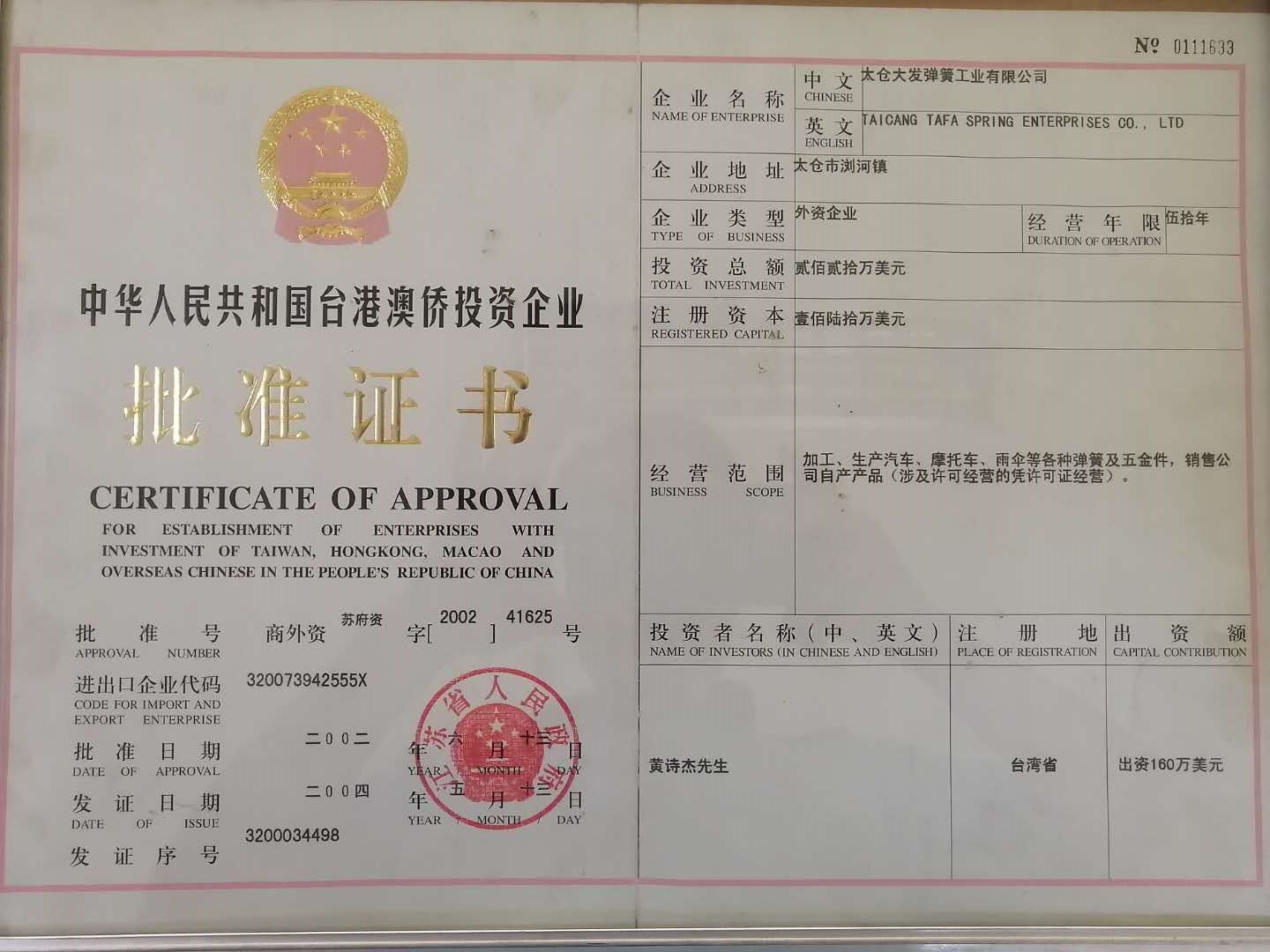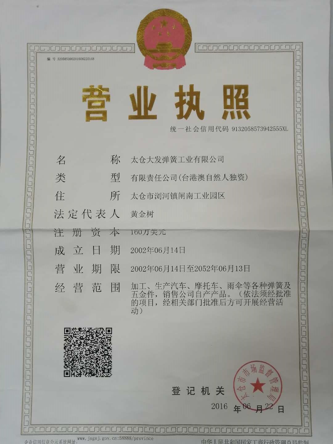 太倉大發(fā)彈簧工業(yè)有限公司由黃金樹先生于1967年始創(chuàng)于臺灣,是一個集雨傘、電子、五金機械、自行車、摩托車、汽車等的彈簧配件生產(chǎn)、加工、輔助設計服務的綜合性企業(yè),其中1990年創(chuàng)辦的廈門大發(fā)彈簧公司、2000年創(chuàng)辦的深圳大發(fā)彈簧公司、2002年創(chuàng)辦的太倉大發(fā)彈簧公司均位于經(jīng)濟發(fā)展地區(qū),地理位置佳。我們憑借在彈簧制造業(yè)的多年豐富知識與技術(shù),并著眼于以客戶為導向,秉持“以人為本,以質(zhì)為先,以客為主,持續(xù)創(chuàng)新”的經(jīng)營理念,強化競爭優(yōu)勢。公司導入ISO9001: 2000質(zhì)量管理體系,執(zhí)行ISO14000:2000管理方式,倡導安全、高質(zhì)量、高素質(zhì)的生產(chǎn)。